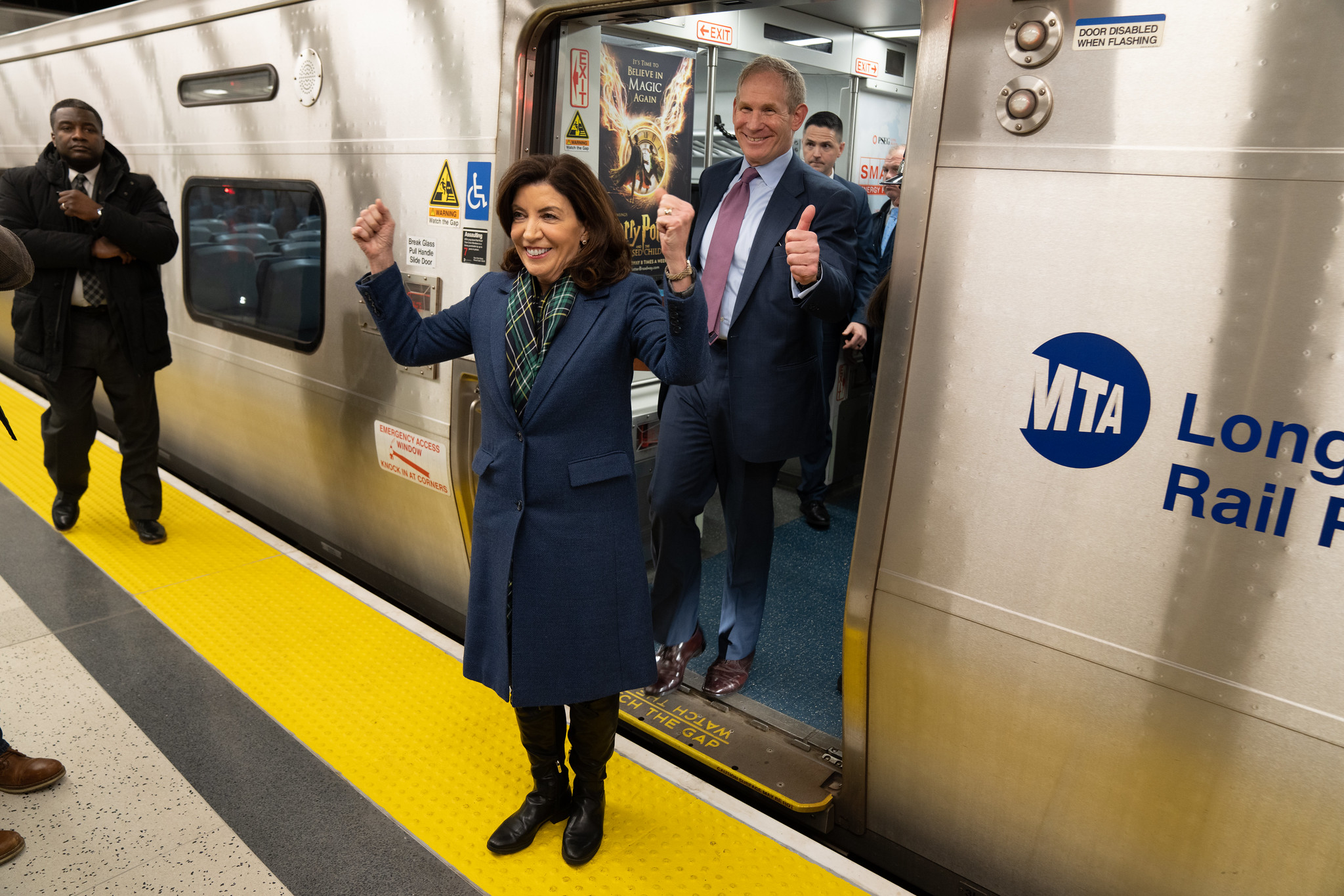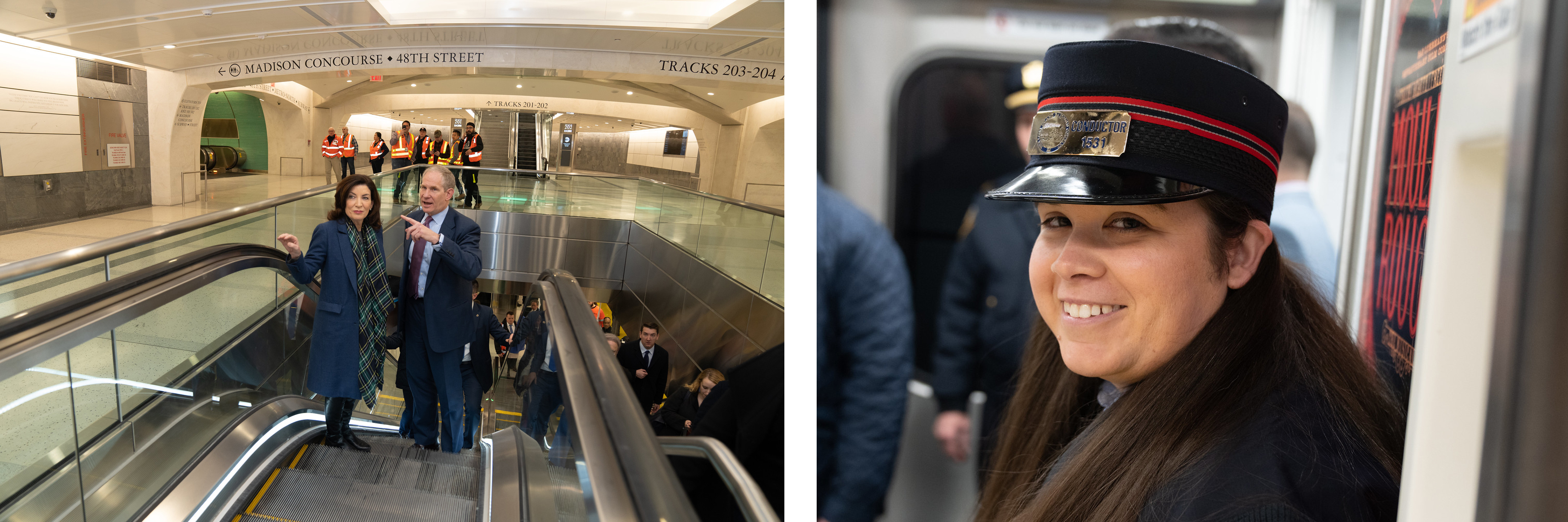 ABOVE RIGHT: Governor Kathy Hochul and MTA Chair and CEO Janno Lieber after riding the inaugural Long Island Rail Road train to Grand Central Madison, which arrived at the terminal platform at 11:07 a.m. LEFT: Happy LIRR Conductor on first public service train into Grand Central Madison. PHOTO CREDIT: NYS Governor's Office