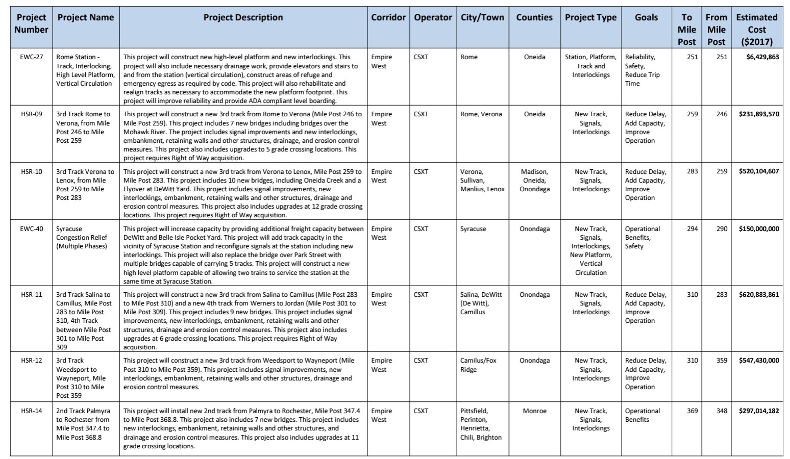 These civil engineering projects will together improve reliability, increase frequency, and reduced travel times for Amtrak service. They include: a second track on the Empire Connection, two sections of third track south of Poughkeepsie and yard improvements at Poughkeepsie, signaling and interlocking upgrades, rock slope stabilization, bridge replacements, track work to increase speeds to 90 and 110-mph, and new high-level platforms at the Rhinecliff and Hudson stations.