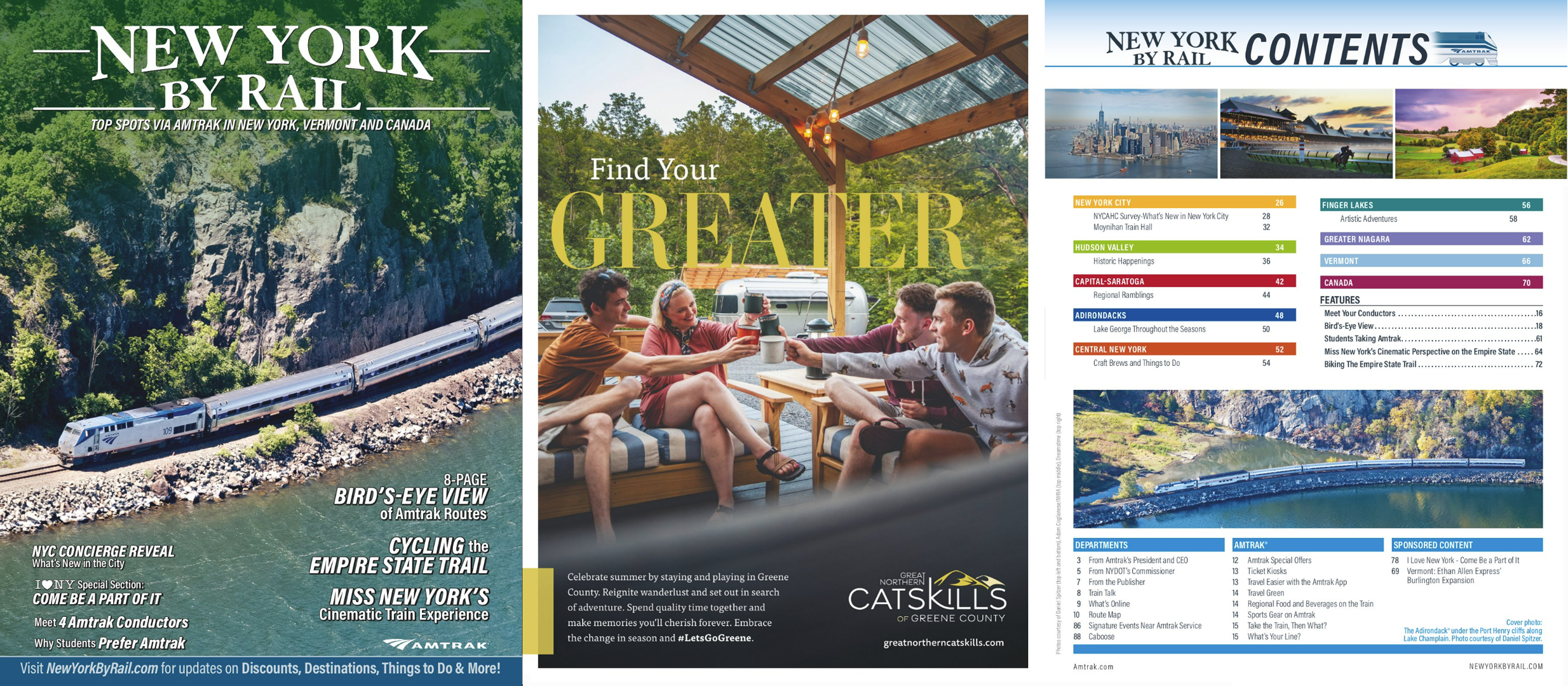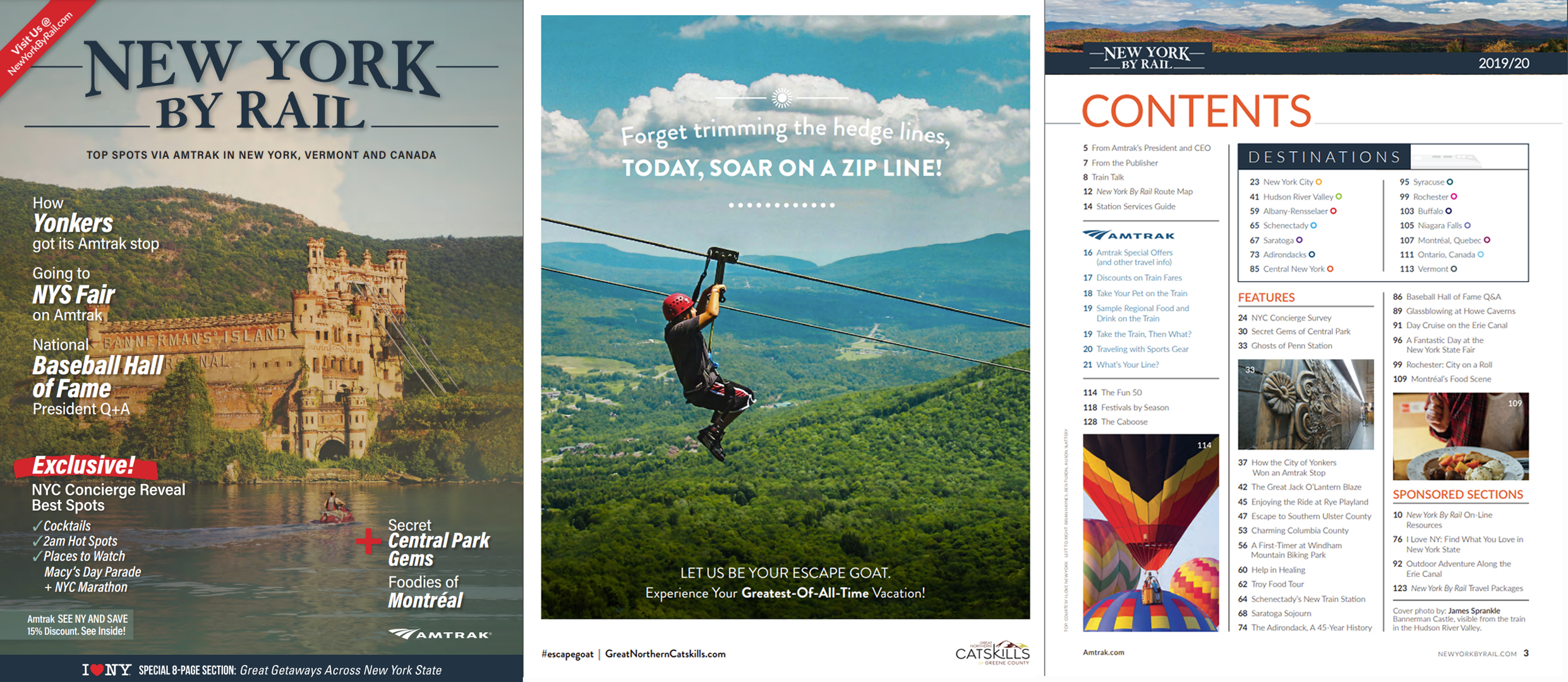 Now its 21th year, 'New York By Rail', has become a leading source of tourist & destination information for the multitude of great locations accessible by rail across New York State. Starting out solely as an on-board magazine, New York By Rail now offers a comprehensive website with destination information, rail-based travel packages, state-wide event listings and much more. New York By Rail has received eight APEX Awards for Publication Excellence in the category of “One-of-a-Kind Publications – Custom Published”. The magazine is publish each spring and distribute 175,000 copies aboard Amtrak trains in our region, at New York State Thruway Information Centers and at fairs, festivals, travel shows and other events across New York State.