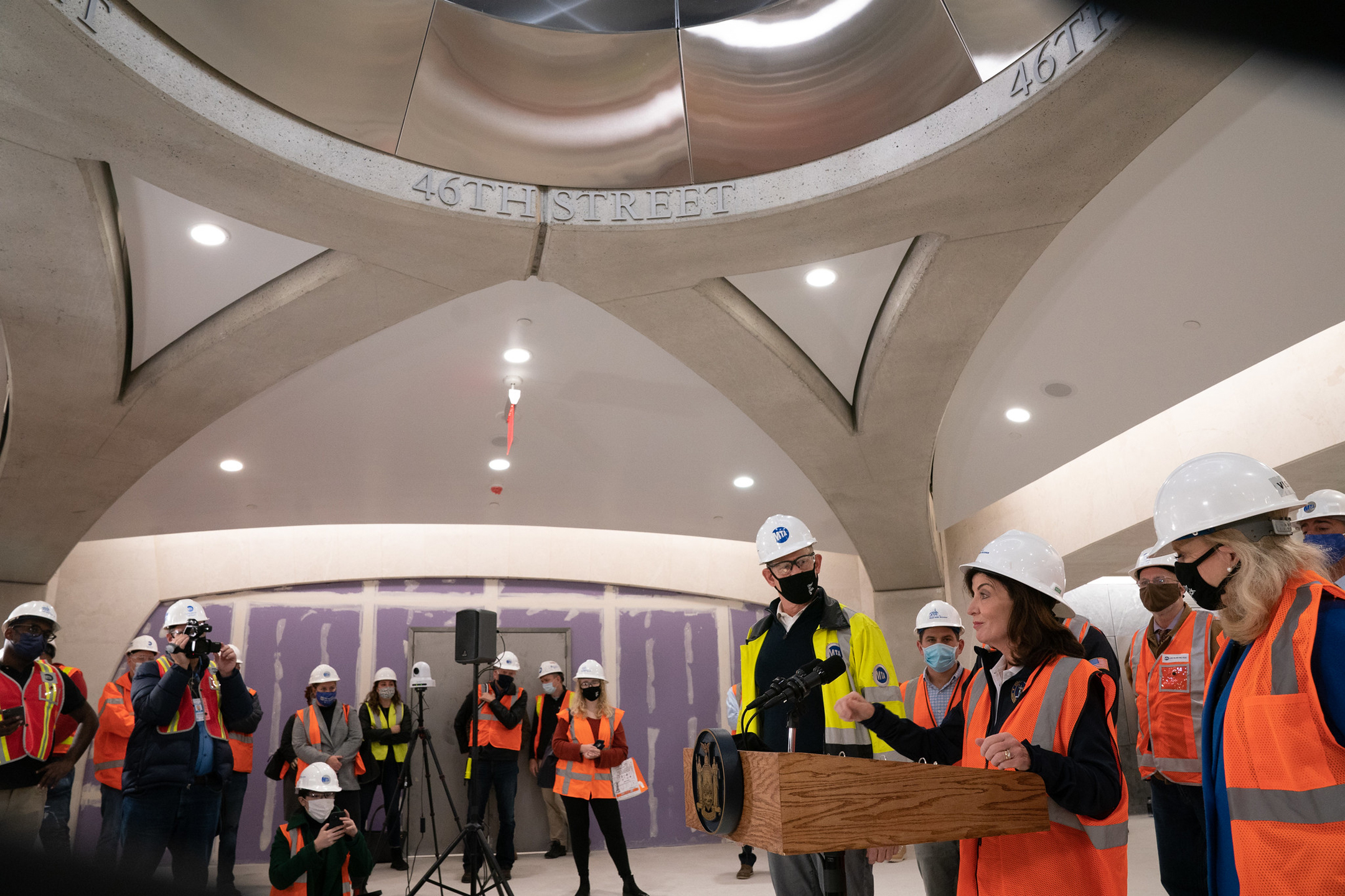 Governor Kathy Hochul today joined the Metropolitan Transportation Authority (MTA) to take a special Long Island Rail Road (LIRR) test train to Grand Central Terminal and gave the public one of the first-ever looks at the new 350,000-square-foot East Side Access passenger terminal there. This is the largest new train terminal to be built in the United States since the 1950s and the first expansion of the LIRR in more than 100 years. Together with the LIRR third track project, the new connection will add 50 percent to the LIRR's capacity into Manhattan with up to 24 trains per hour and cut travel time for Queens and Long Island commuters traveling to the east side by 40 minutes per day. It will also reduce crowding on commuter rail, at Penn Station and on the subway by dispersing commuters and allowing passengers to go directly to Grand Central Terminal from destinations across Queens and Long Island. The new commuter rail route and concourse officially open in December 2022.