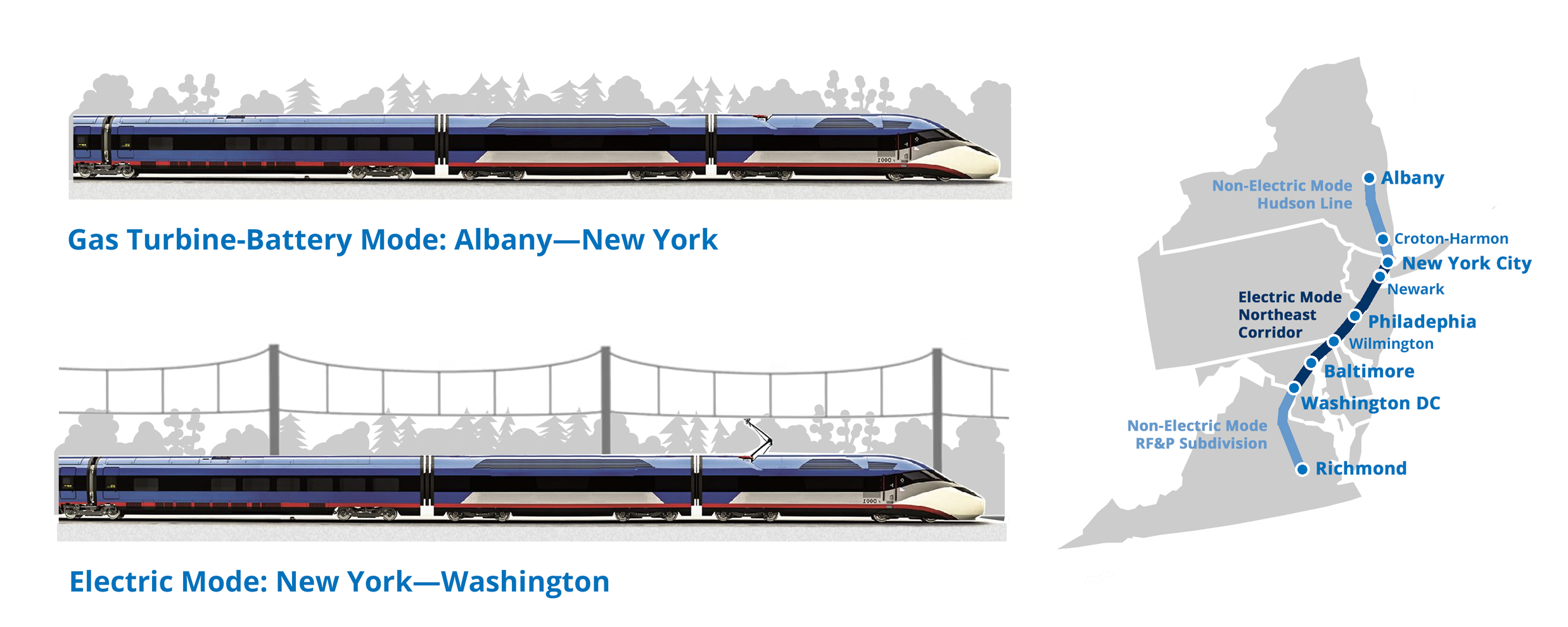 “The plan, however, is for the current Albany-Richmond Acela runs to have a small dedicated sub-fleet of Avelia Liberty sets where we will insert a gas-turbine power car that will feed electricity to the traction motors of the two electric power cars for running over unelectrified tracks up to 110 MPH.