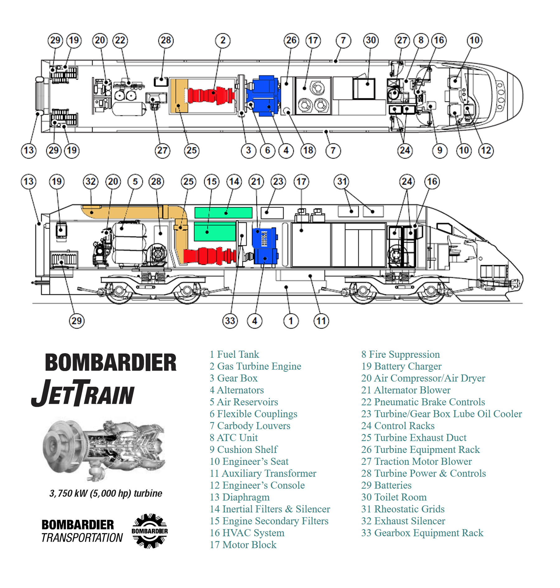 “In high-speed passenger service, the JetTrain is highly efficient and practically silent even at full power. Due to its lighter weight and modern engine, the JetTrain has greenhouse gas emissions that are 30% lower than a diesel unit operating at the same speeds, and now that is using renewable biodiesel, its carbon emissions are very low.