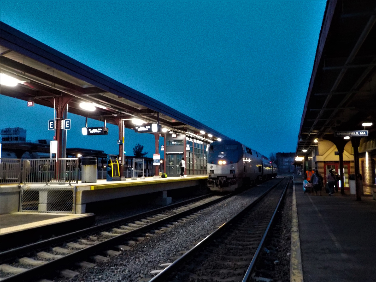 A CT Rail Amtrak train waiting to depart at Springfield Union Station during the evening of February 13th 2020
