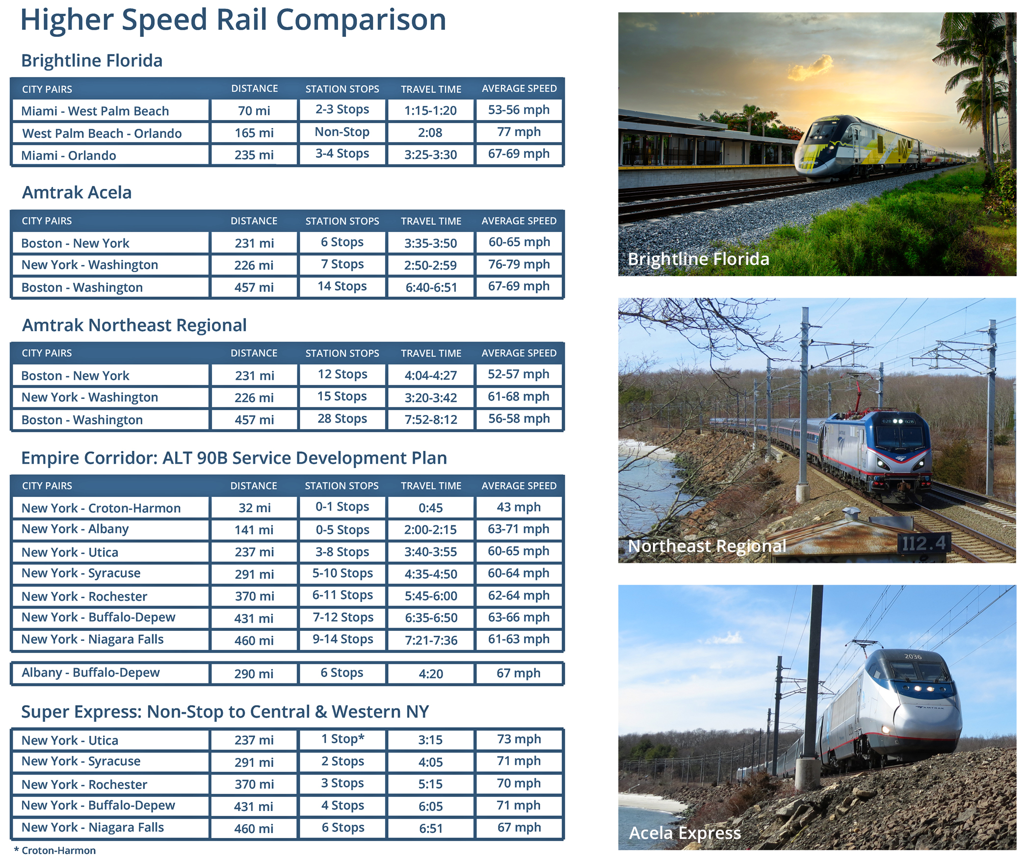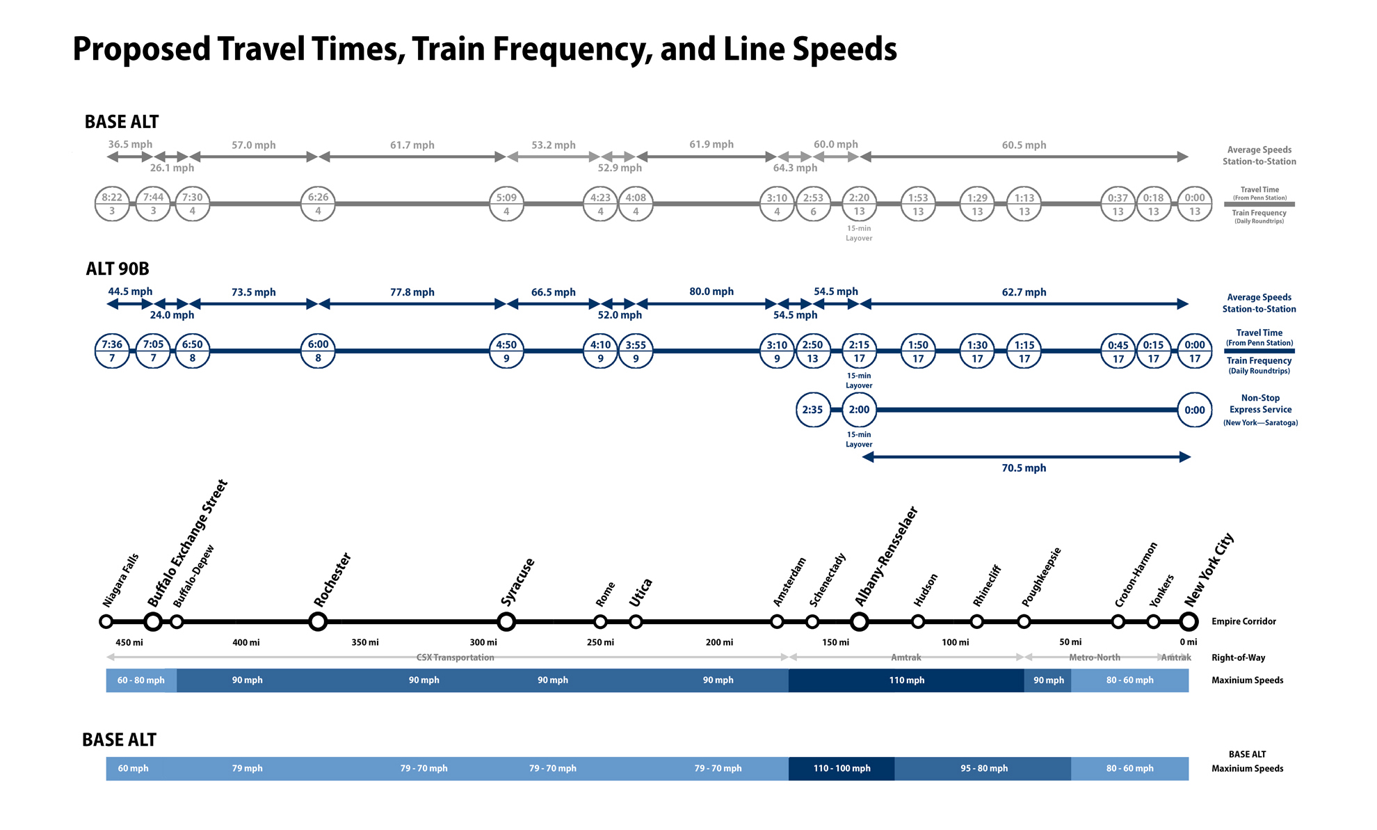 ABOVE: An infographic illustrating the reduction in travel times between major destinations by skipping intermediate stations for some limited-stop express frequencies. The top two train frequencies – Empire Service and Empire State Express – are included in the ALT 90B Service Development Plan, the bottom “Super Express” is a possible express service that could be included in an updated Service Development Plan.