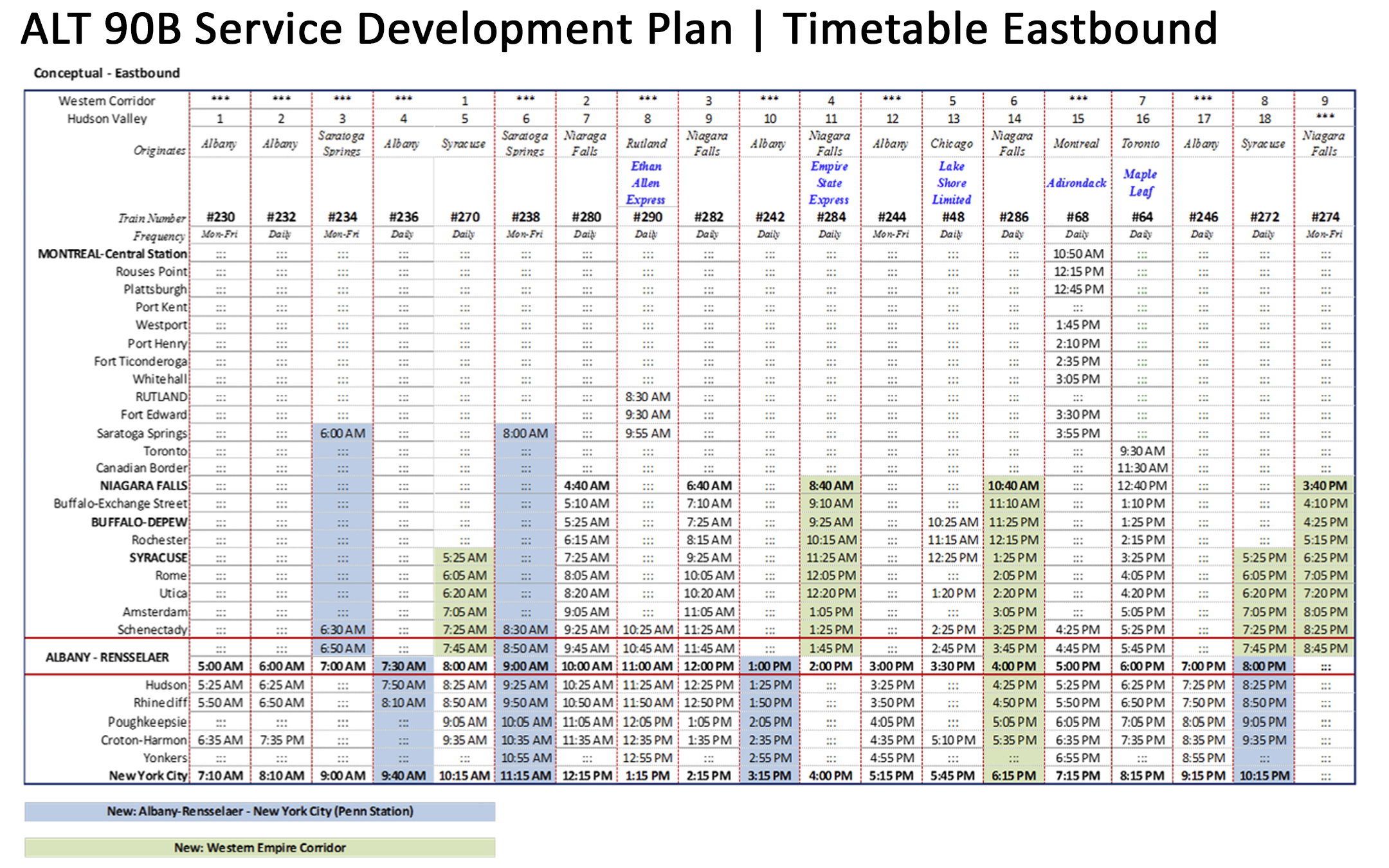 BELOW: An modified timetable from the Service Development Plan, modified to include three additional roundtrips between New York City and Niagara Falls, including new morning and evening expresses—in addition to several existing semi-express frequencies—and an overnight red-eye service, which existing overnight bus service between New York and Buffalo by Greyhound and FlixBus indicates there is a sizable travel market for intercity rail to serve as well.