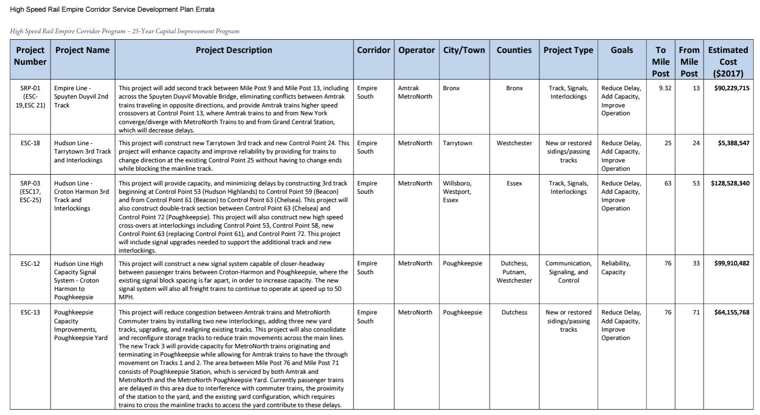 On the Empire Corridor South between New York City and Albany-Rensselaer, Alternative 90B includes the majority of the projects that were compiled in the Hudson Line Railroad Corridor Transportation Plan of 2005. These improvement projects were identified and agreed upon by the joint-users of the railway, including Amtrak, Metro-North, CSX, and Canadian Pacific (now CPKC), with NYSDOT included as a major stakeholder.