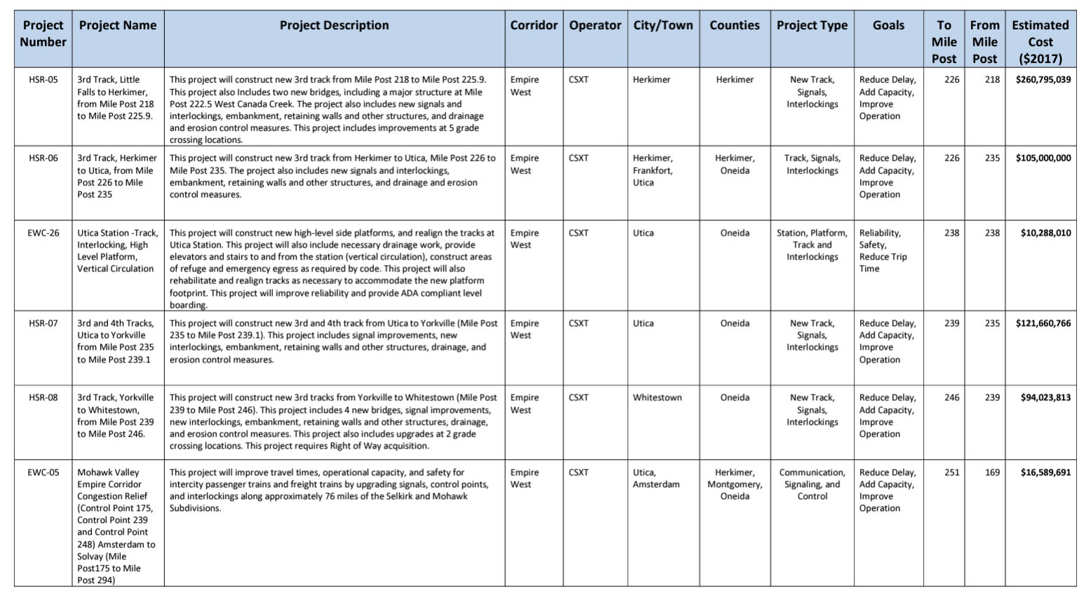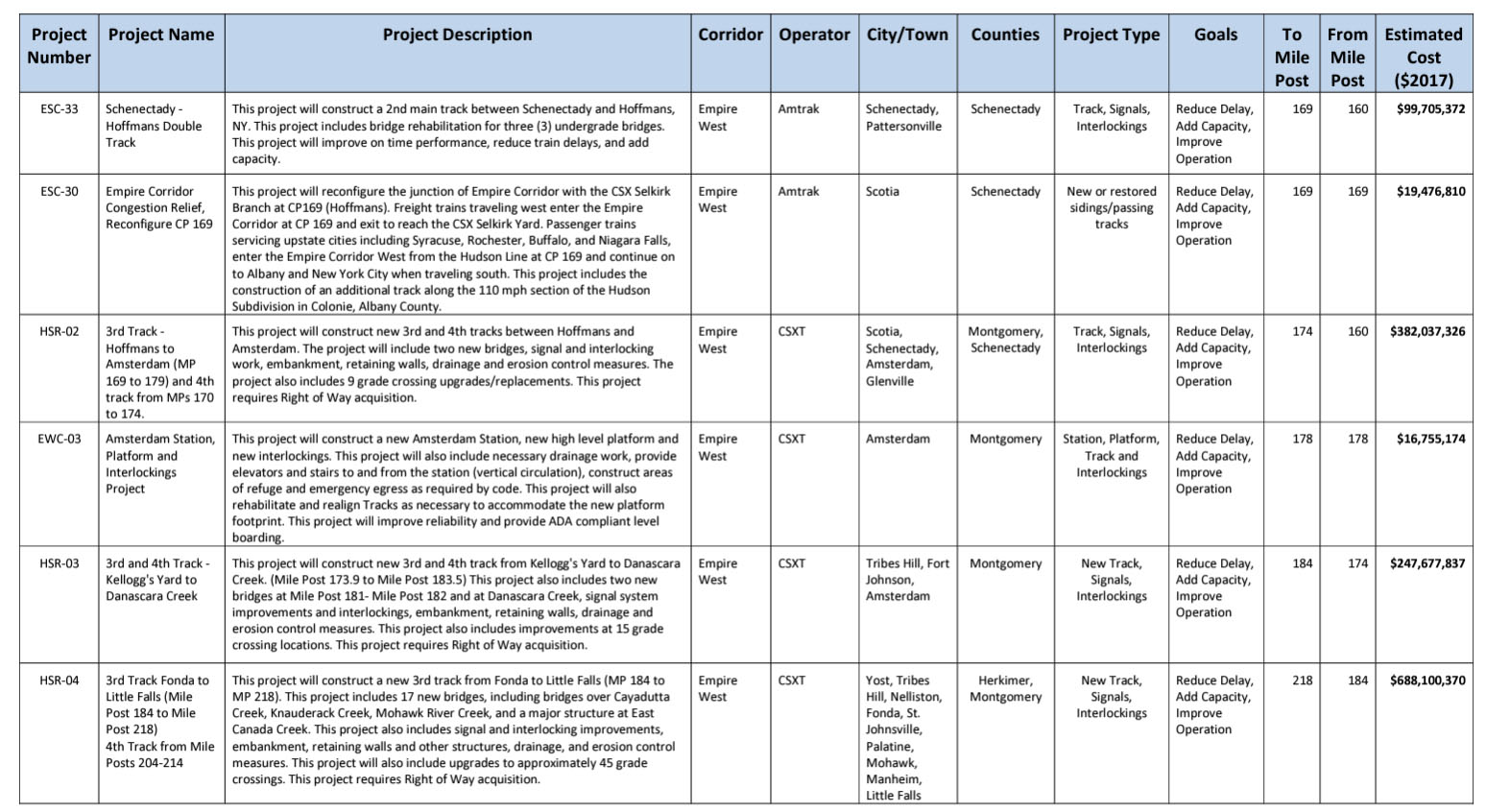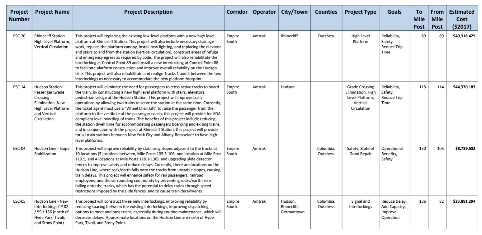 These civil engineering projects will together improve reliability, increase frequency, and reduced travel times for Amtrak service. They include: a second track on the Empire Connection, two sections of third track south of Poughkeepsie and yard improvements at Poughkeepsie, signaling and interlocking upgrades, rock slope stabilization, bridge replacements, track work to increase speeds to 90 and 110-mph, and new high-level platforms at the Rhinecliff and Hudson stations.