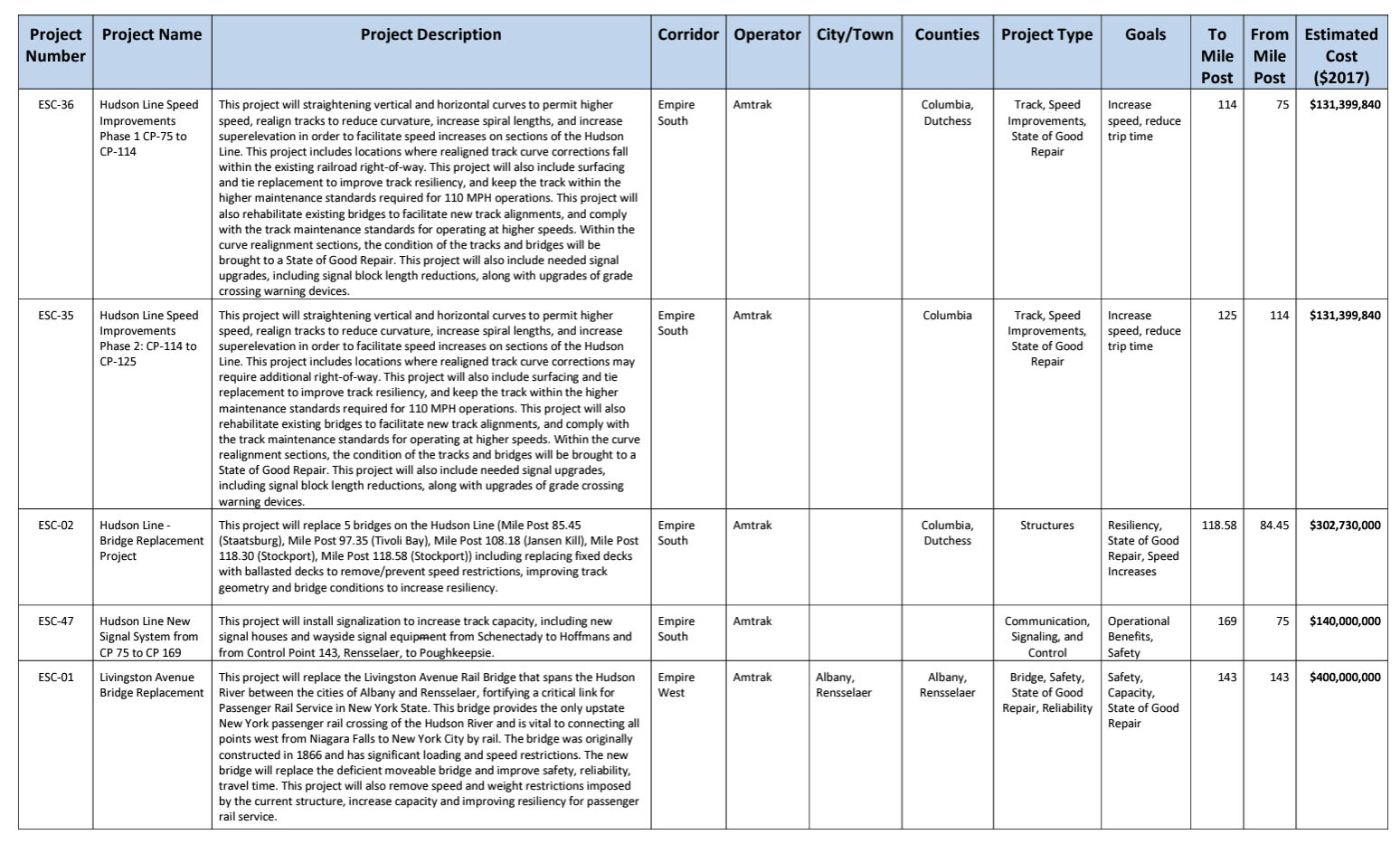 Constructing a new movable Livingston Ave Bridge across the Hudson River between Albany and Rensselaer is the biggest project, at an estimated $400 million. The existing railroad bridge has stone piers dating from the 1860s and a steel superstructure from the early 1900s. Its deteriorated state limits trains to crossing to one at a time at 15-mph, while troubles operating the swing bridge can delay both rail and maritime traffic. A new lift-type bridge would bring the crossing up to modern rail standards, include a new recreational walkway, while reliably accommodating waterborne on the river.