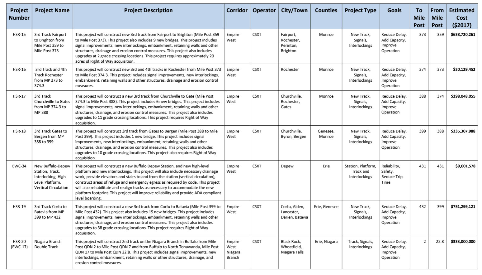 Additional infrastructure would include three grade separated flyovers—one east of the Dewitt Yard east of Syracuse (MP 279); another to the east of the Rochester Yard (MP 366), and one east of the Buffalo-Depew Station (MP 427)—where the third track would pass over the two existing freight tracks on an elevated structure, avoiding freight yards located on the northside of the mainline and to reach existing stations located on the southside of the mainline. While capital intensive, the Service Development Plan sees the flyovers as worth the cost in minimizing interference between freight and passenger traffic that could lead to delays and longer travel times.