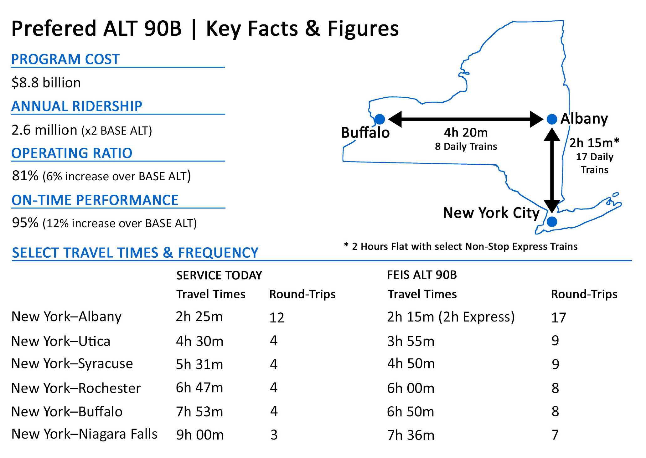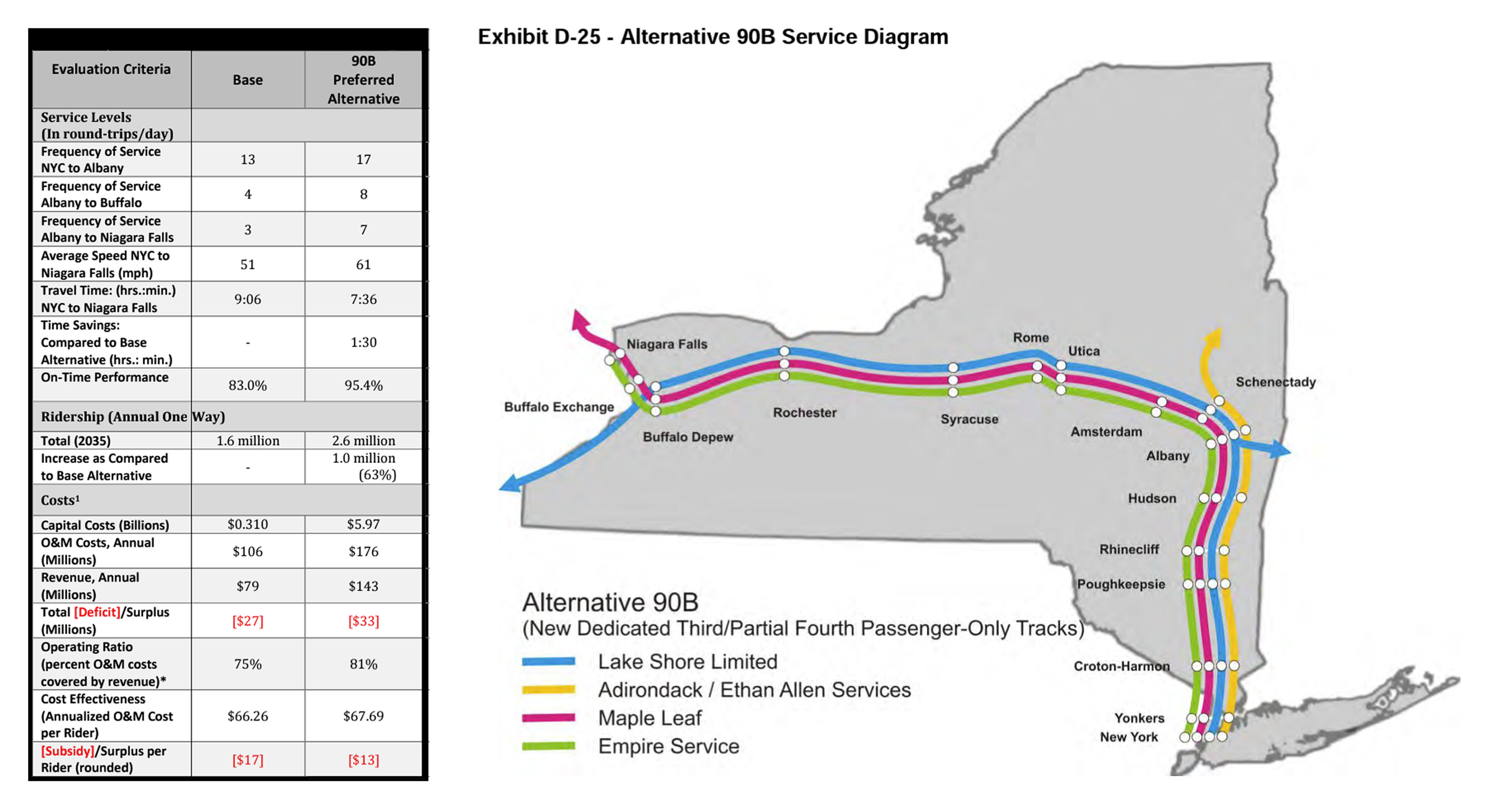 Alternative 90B, would result in a 1½ hour savings in travel time and a 10 mph faster top speed over the Base Alterative, with four additional roundtrips west of Albany to Buffalo, for a total of eight roundtrips, with a 95% on-time performance. Minutes-delayed and trip times for CSX freight between the Selkirk Yard south of Albany to Buffalo would be reduced as well. The current project cost is estimated at $8.8 billion over 25 years, with approximately $240 - $250 million annually. Future costs will vary due to inflation and changes to the Service Development Plan. Annual ridership is estimated at 2.6 million, a million more than the Base Alterative, with an 81% operating ratio, 6% higher than the Base Alterative.