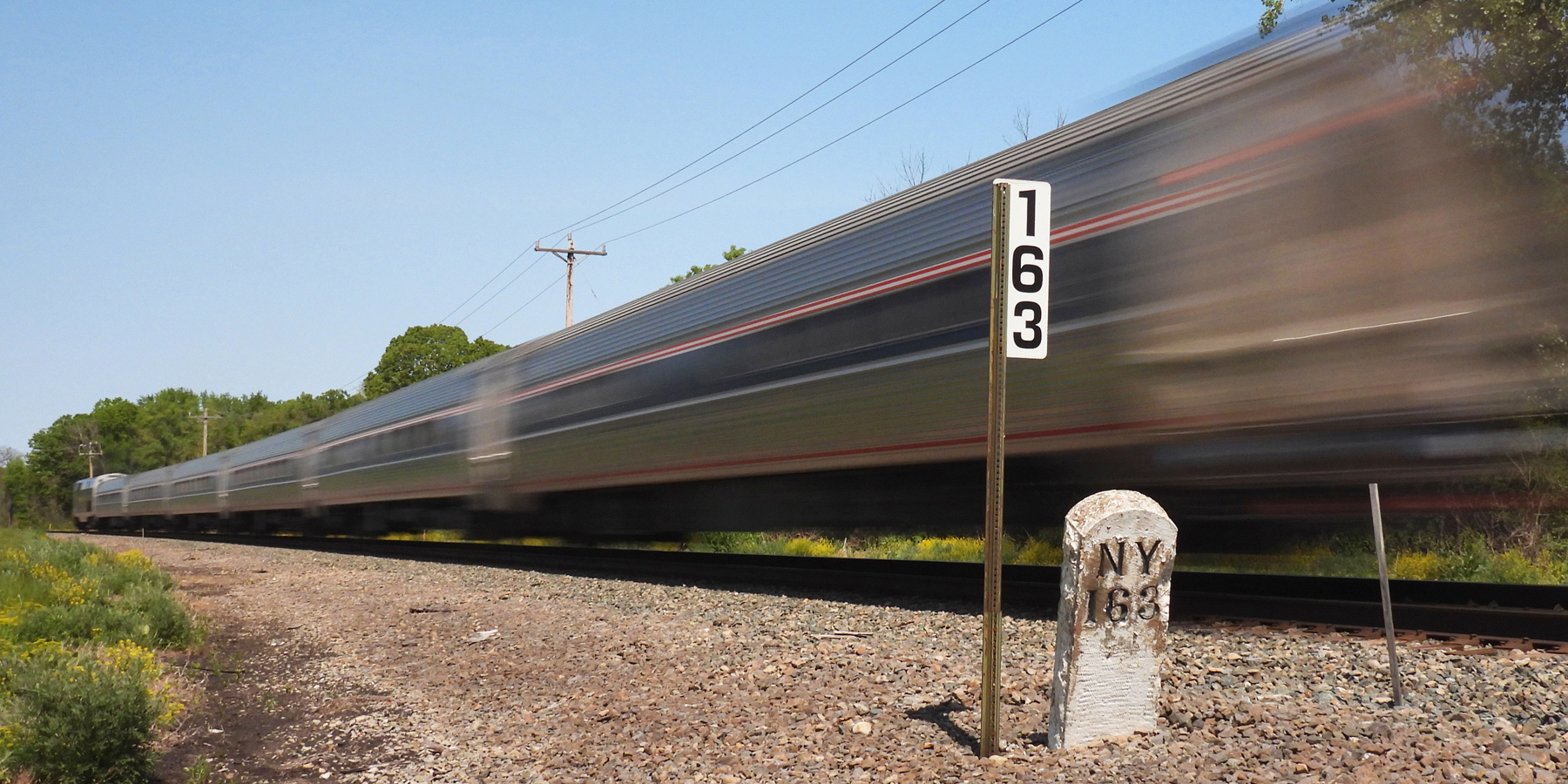 ABOVE: A Empire Service train racing westbound at about 95 MPH in Glenville NY, west of Schenectady on Amtrak's Hudson Line. ALT 90B would extend 90MPH speeds west of the Capital District to Utica, Syracuse, Rochester, and Buffalo on new dedicated "express tracks" for passenger trains.