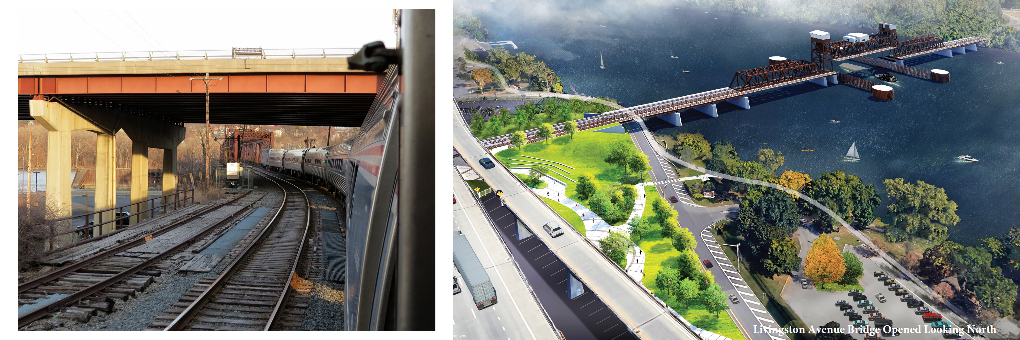 ABOVE: A rendering from NYSDOT on the right of the new Livingston Ave Bridge (LAB) from the Albany side, on the left a photo the approach of the existing bridge. The new lift bridge would be built south of the existing swing bridge and incorporate a new recreational pathway for pedestrians and cyclists. Passenger train speeds will rise from 15 to 30-mph over the new span (the curving track at each end having an existing 40-mph speed limit) with two trains allowed to cross simultaneously.