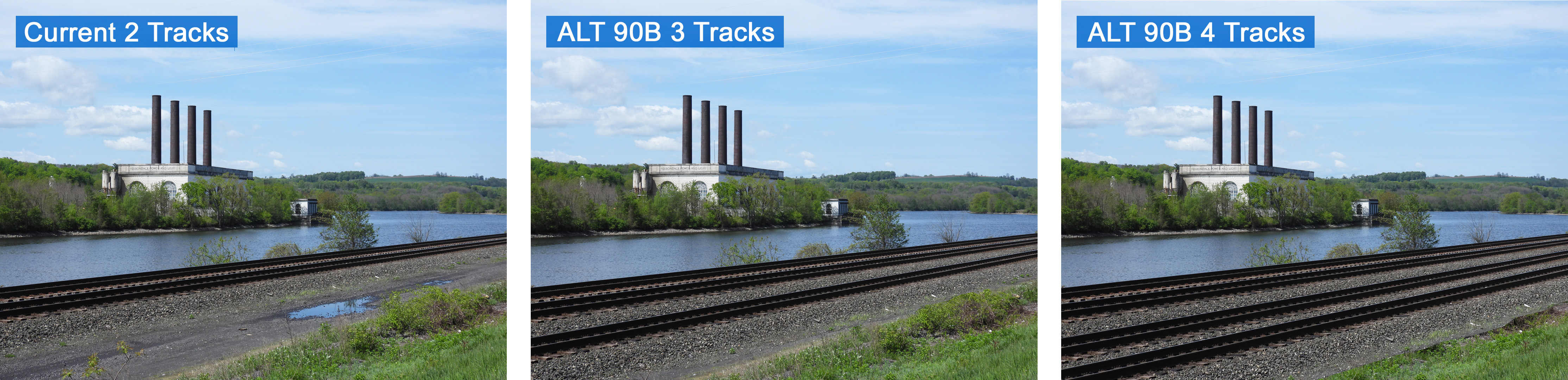 ABOVE: A photo progression illustrating how the new third and fourth dedicated passenger tracks will utilize the surplus right-of-way north of the existing double-track mainline. Location is Lock E10 on the Mohawk River east of Amsterdam NY.
