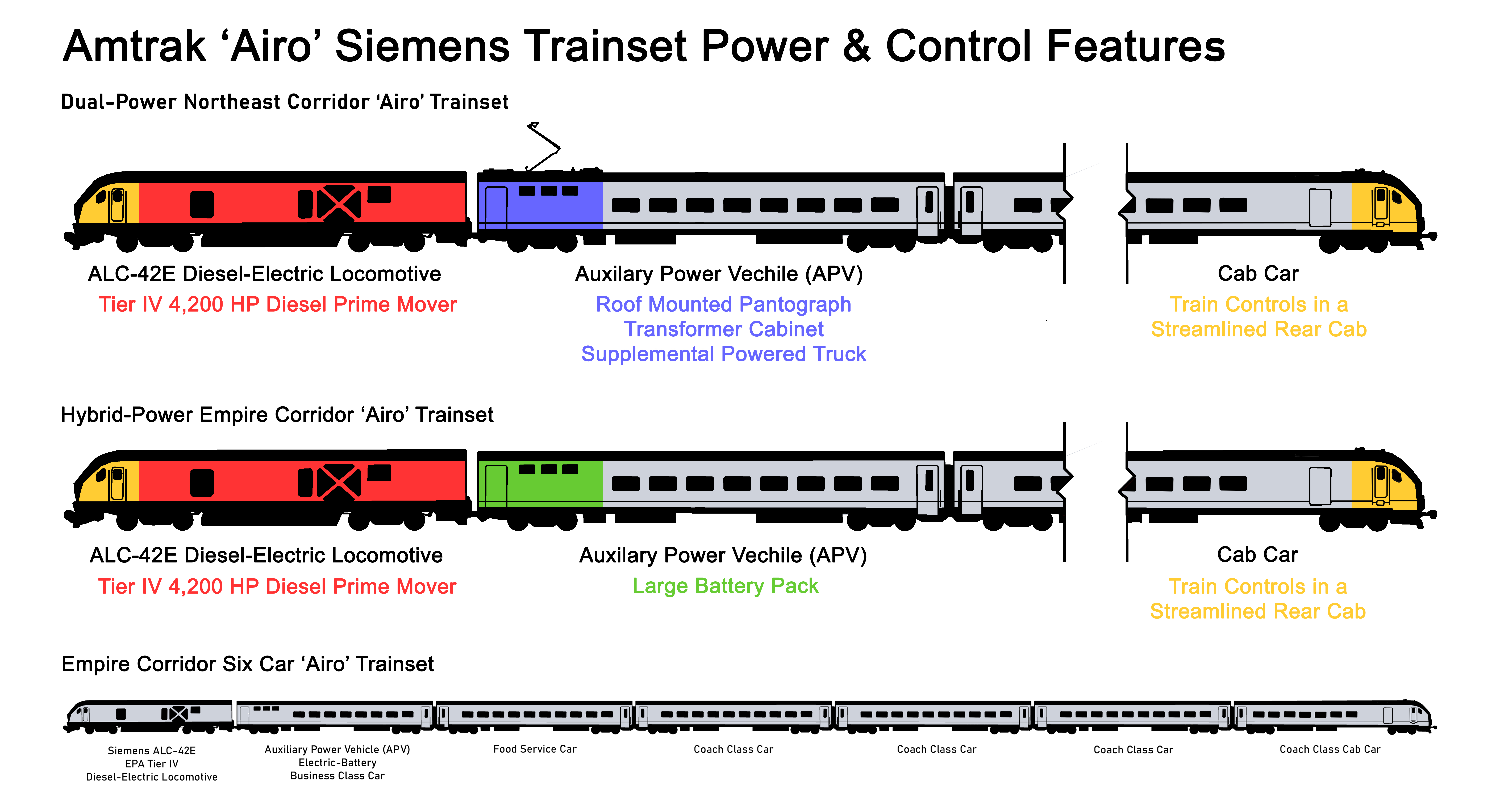 The APV will part of a semi-permanently coupled consist of six Siemens Venture coaches, the rear coach having a streamlined cab for push-pull bidirectional travel, simplifying and speeding up turnarounds at terminal stations. The battery will eliminate the current use of DC third rail by the existing fleet of aged eighteen GE Genesis P32AC dual-mode engines. A prototype Empire Corridor Airo trainset is planned to be available for testing by 2025, with the rest of the trainsets being delivered by 2030.