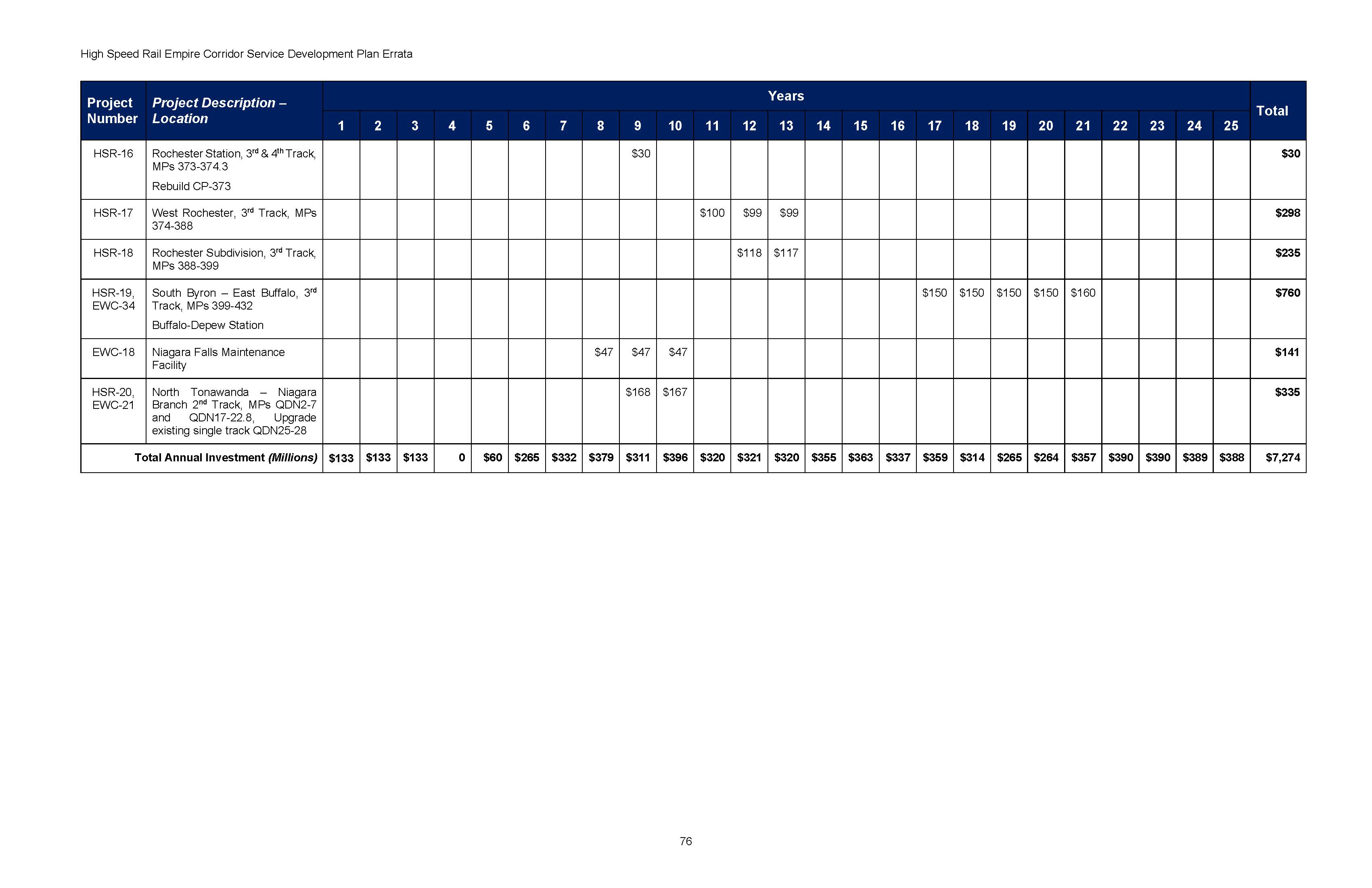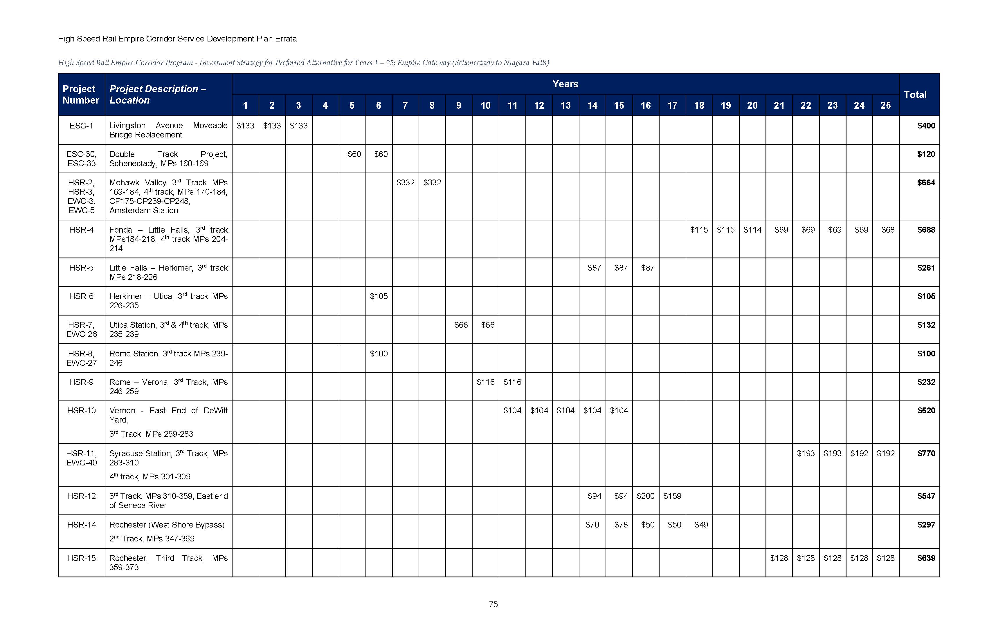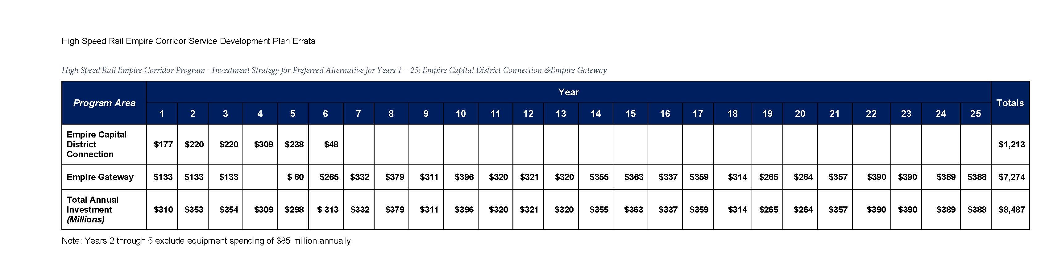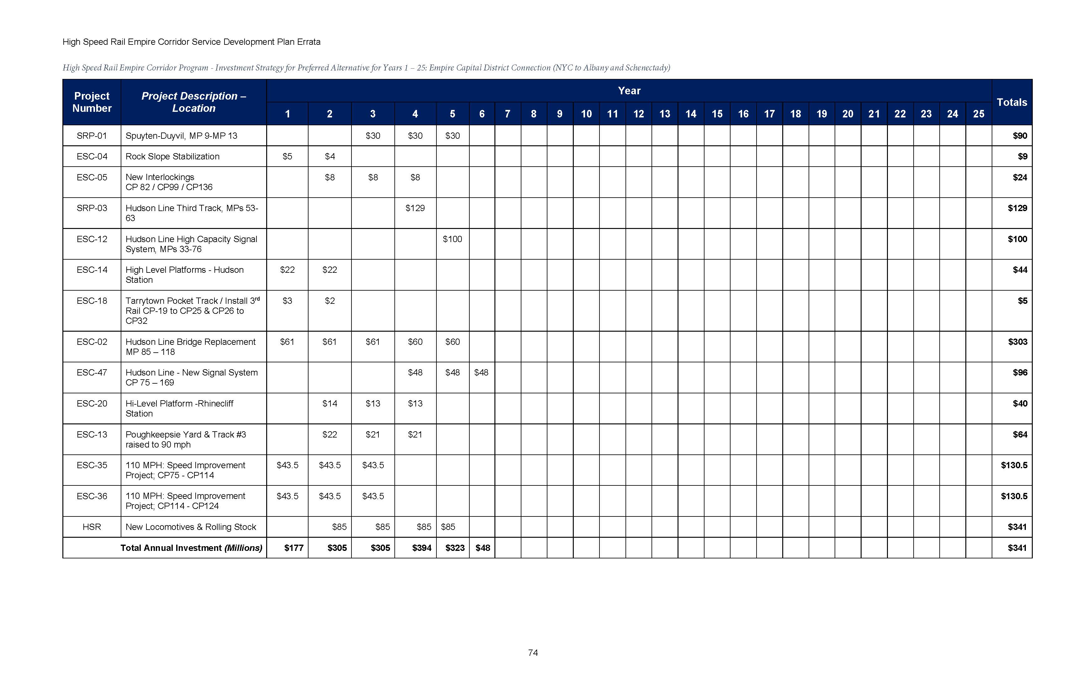The Final Tier I EIS includes a Service Development Plan with the schedule for implementation of the Preferred Alternative, to guide the 25 years of continued investment till project completion. The SDP outlines in detail a program of major infrastructure construction, and includes how the resulting new passenger service will be operated, equipment requirements, funding needs, and management systems. The Service Development Plan is being updated by NYSDOT with a $500,000 federal grant as of 2024, due to the length of time of competing the SDP, with key cost estimates in the report dating to 2017.