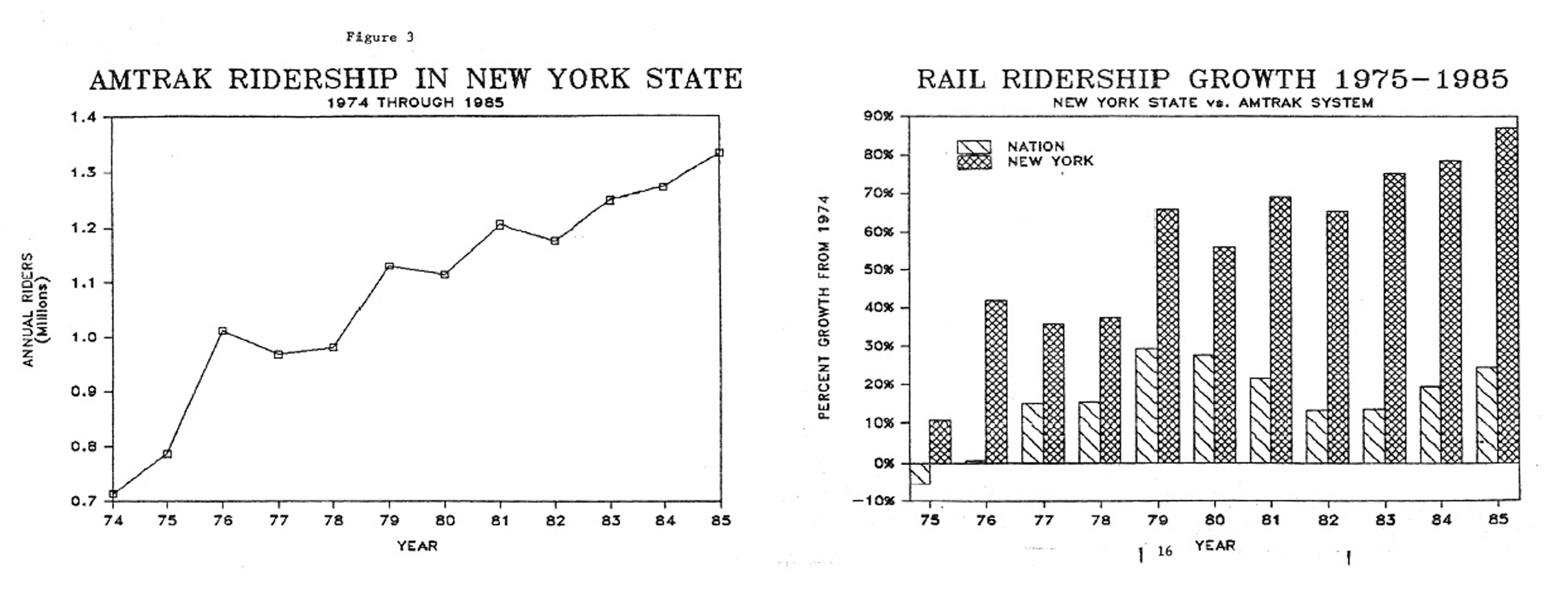 Ridership growth for the Empire Corridor during the ten year High Speed Rail Program of 1975-85, graphics from NYSDOT report.