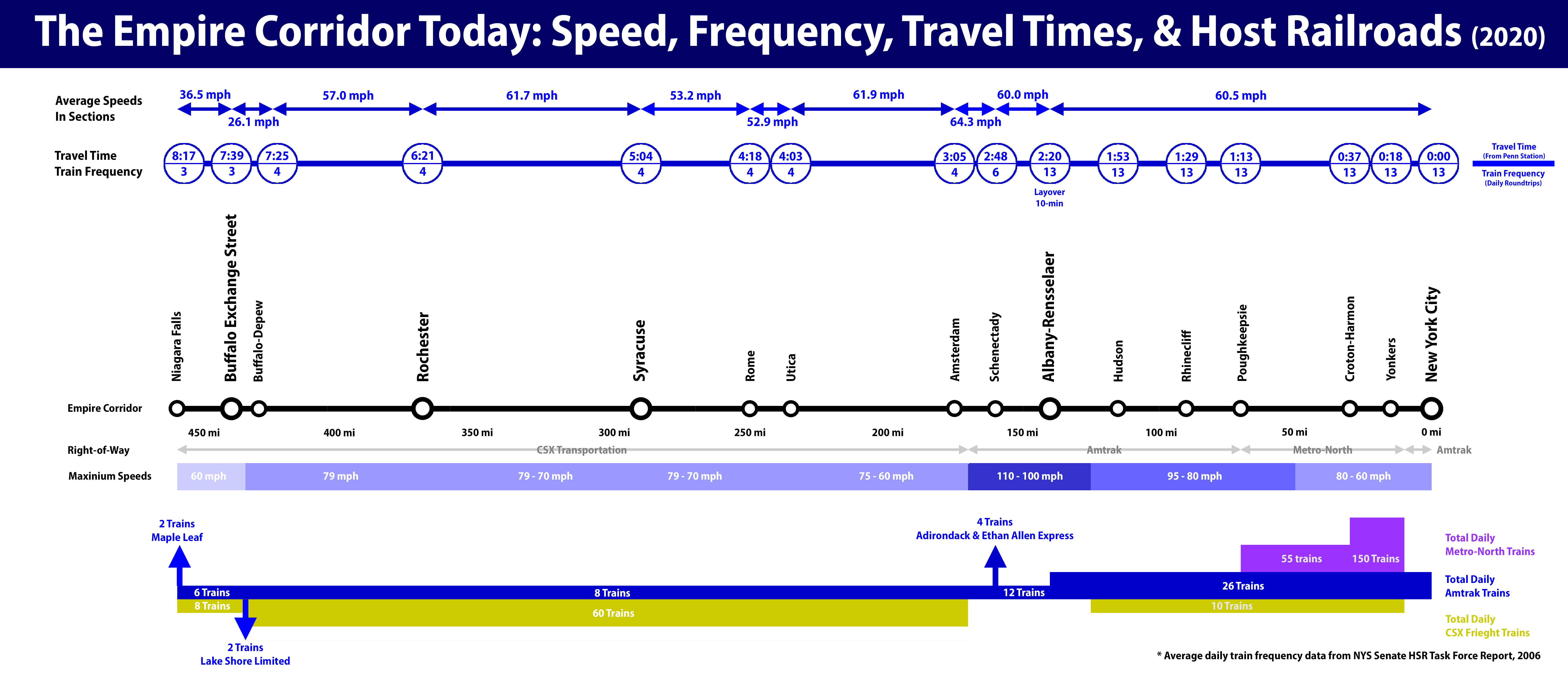 Today there are 13 Empire Corridor round-trips New York-Albany and 4 round-trips New York-Buffalo, including the Lake Shore Limited to Chicago. In FY 2016-17 the Empire Corridor saw 1.7 million passengers with 1.2 million of those New York-Albany. Since 1995 ridership has increased about 30% according to statistics provided by the New York State Department of Transportation (NYSDOT).