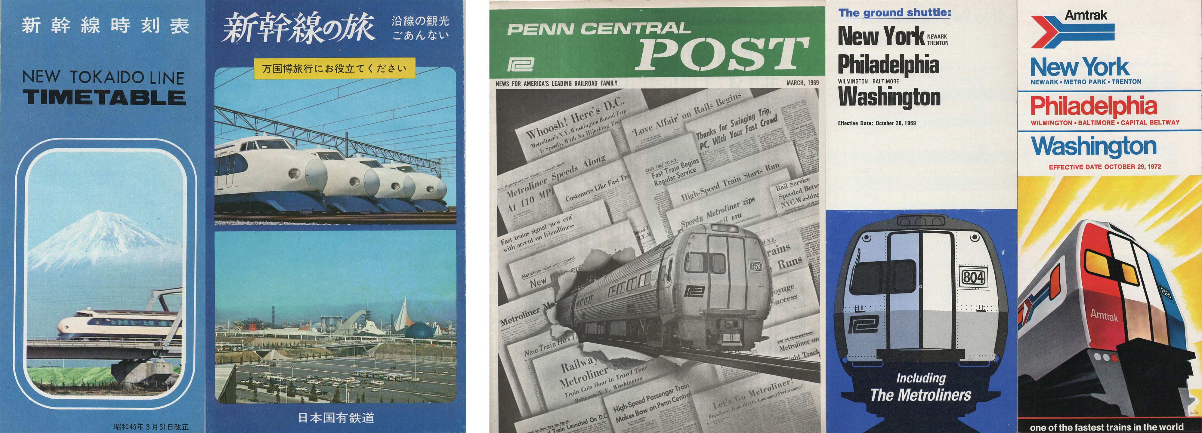 ABOVE RIGHT: The inaugration of the Tokaido Shinkansen in Japan before the 1964 Tokyo Olympics with its 130-mph "Bullet Trains" breathed new life into passenger rail, encouraging a number of high-speed intercity passenger modernization projects around the world. ABOVE LEFT: In America the US Goverment and Pennsylvania Railroad partnered on the Metroliner – the predessor of today's Acela Express – which enter service on January 16, 1969.