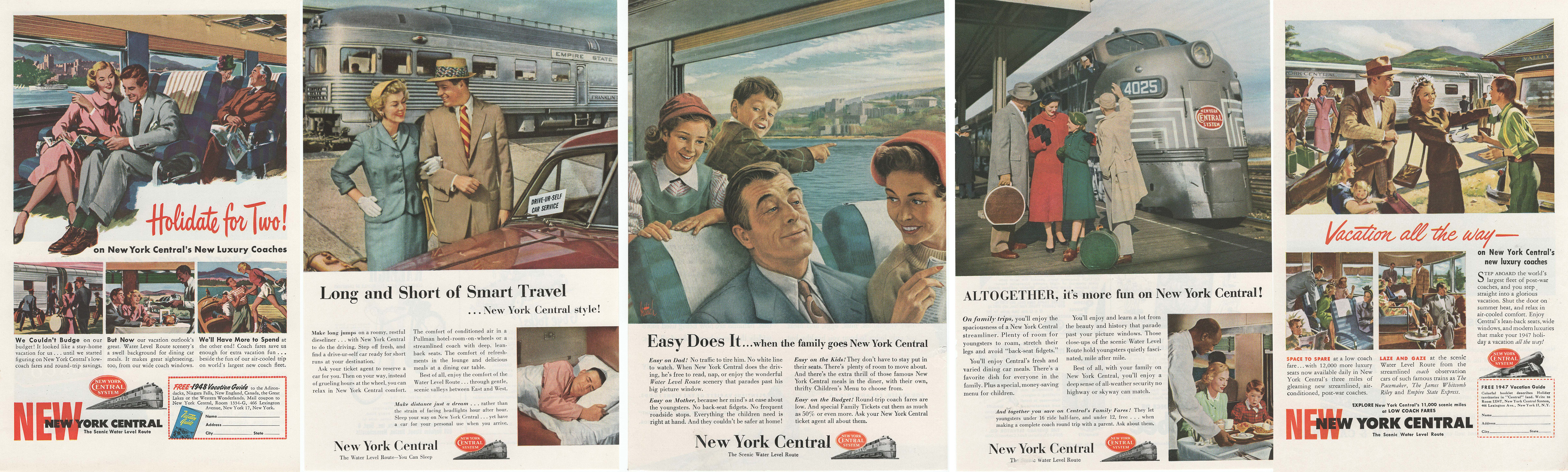 Colorful print advertising from the 1950s for the New York Central's long-distance intercity passenger service.
