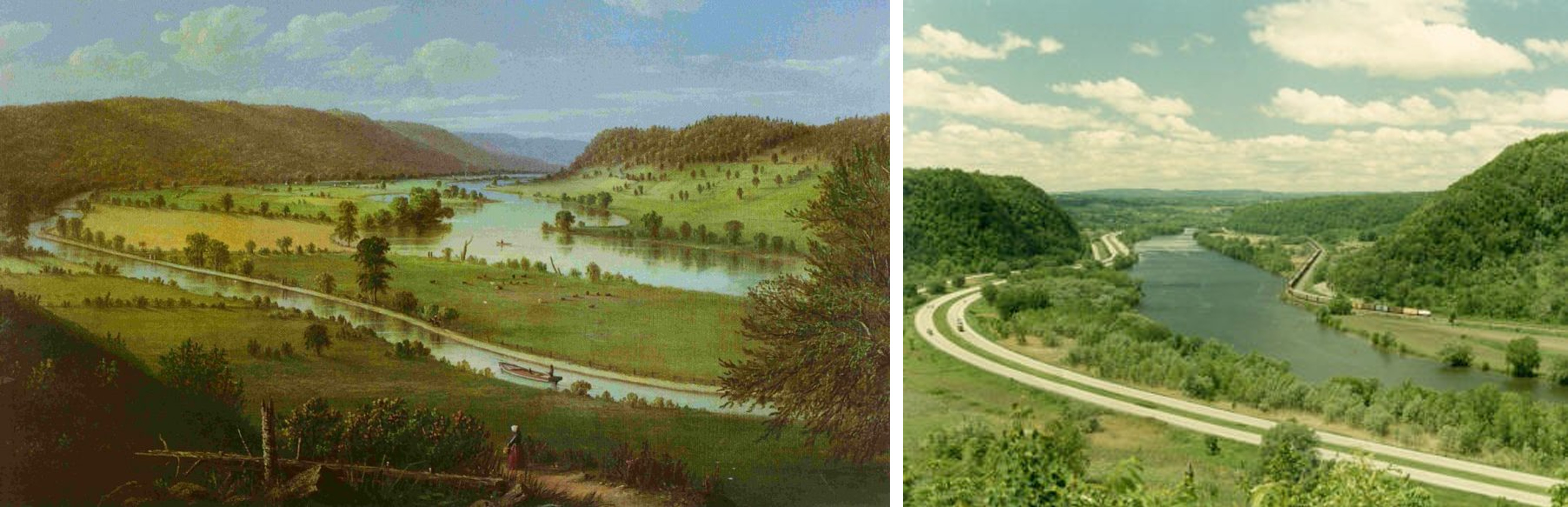 LEFT: Early View of the Erie Canal and the Mohawk River looking west up the Valley. RIGHT: A mid-20th century view of the Mohawk Valley view with (L to R) the NYS Thruway, Mohawk River/NYS Barge Canal, and former New York Central mainline.