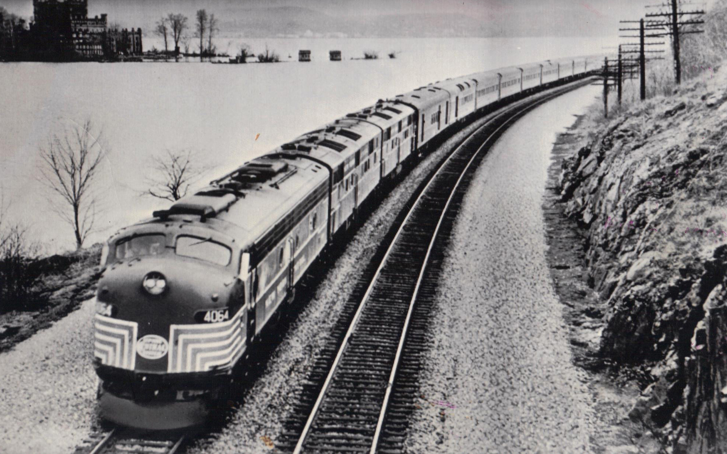 ABOVE: The New York Central System passenger timetable from October 1959. BELOW: 2oth Century Limited along the Hudson River.