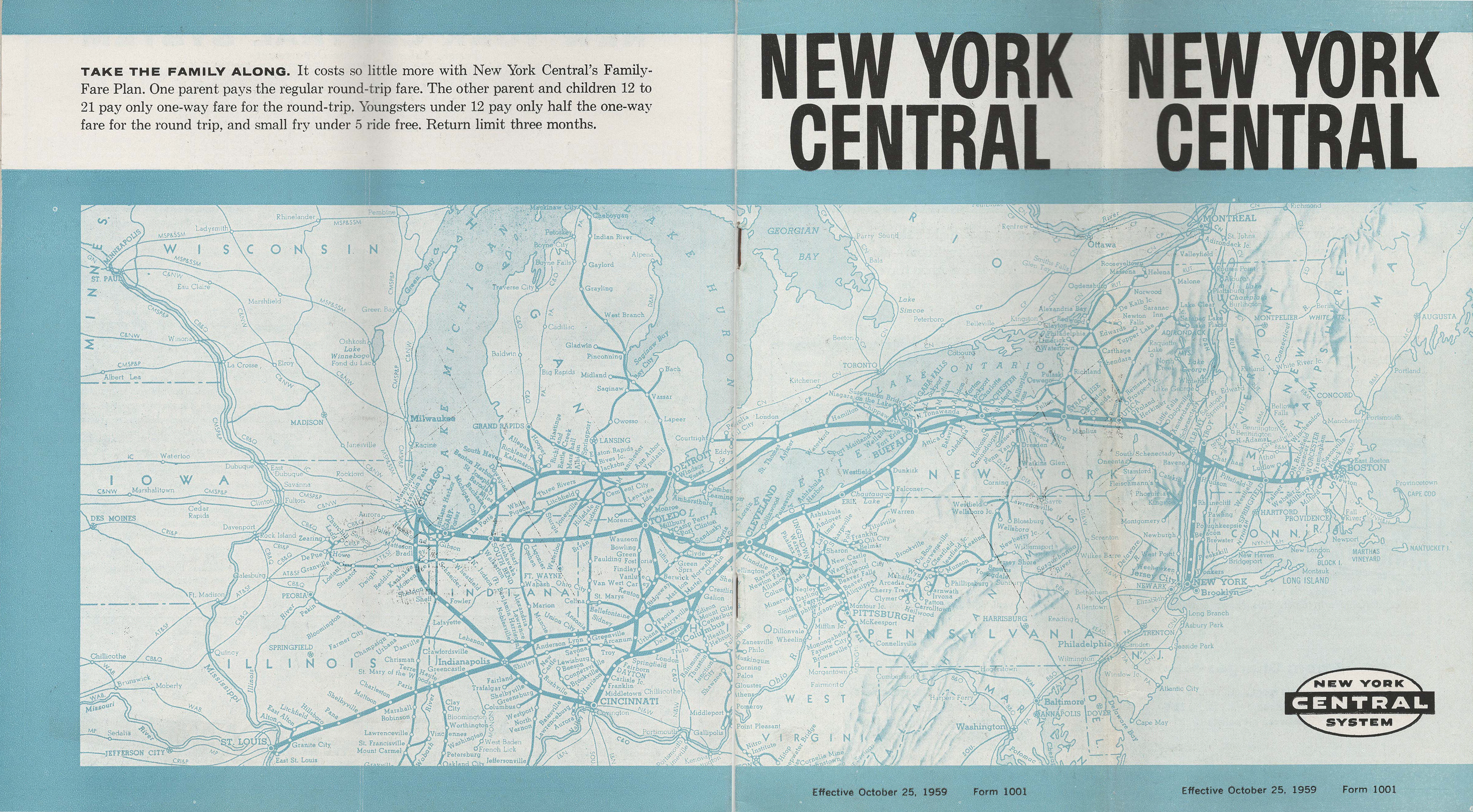 The Central consolidated 11 daily local and long-distance trains out of New York City into eight round-trips New York-Albany, five round-trips New York-Buffalo, and one additional round-trip Albany-Buffalo. Three of the New York-Buffalo trains continued via connections at Buffalo Central Terminal west to Cleveland & Chicago, including the no name successor to the 20th Century Limited (predecessor to today’s Lake Shore Limited). In addition, two connecting trains operated west of Buffalo through Southern Ontario to Detroit and then onto Chicago through Michigan. And a daily overnight round-trip connection to Toronto was also provided.