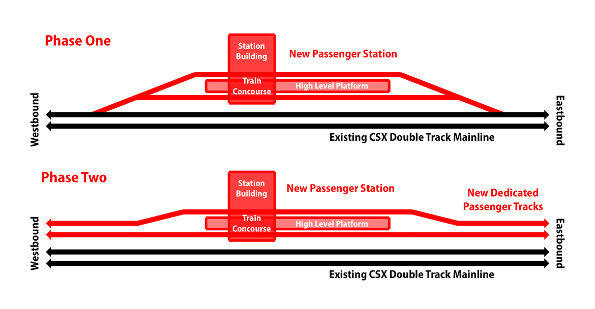 This improvement would eliminate the current loading of passengers onto trains on Track 2 by crossing and standing on Track 1 allowing for simultaneous train operations on both mainline tracks. This will reduce delays by eliminating the safety requirement that dispatchers hold opposing trains from passing through the station tracks when Amtrak trains are boarding and alighting passengers.