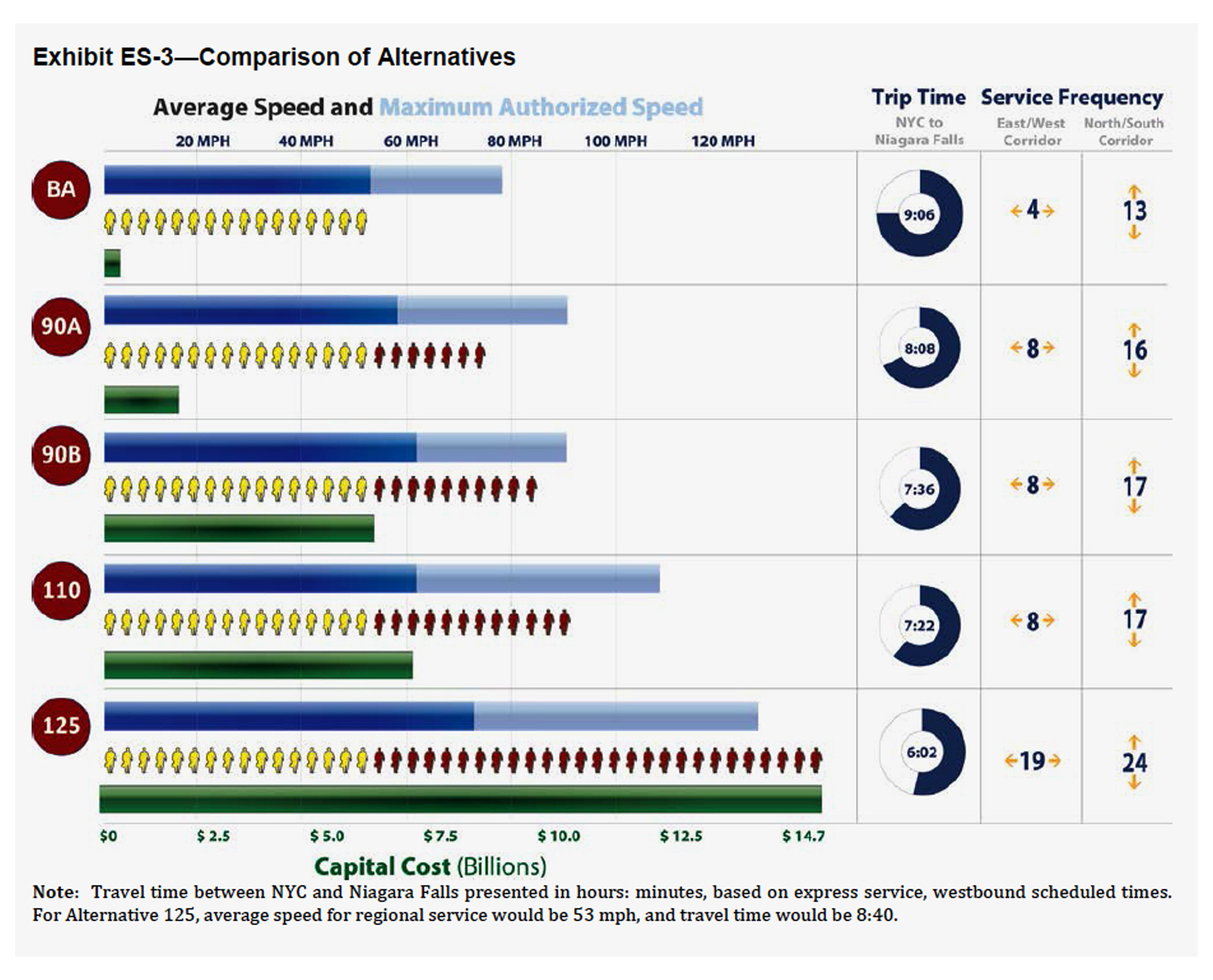 Then there are a number of infrastructure projects north and west of Albany whose planning and construction could be funded before a final Empire Corridor EIS is released. The lack of a final master plan might seem an immovable obstacle to investments in infrastructure – since how can you build before you know what your building – yet there are a few projects that can go ahead so as long as they accommodate all future infrastructure and service plans laid out in the four build alternatives (90A, 90B, 110, and 125) of the 2014 Empire Corridor DEIS.