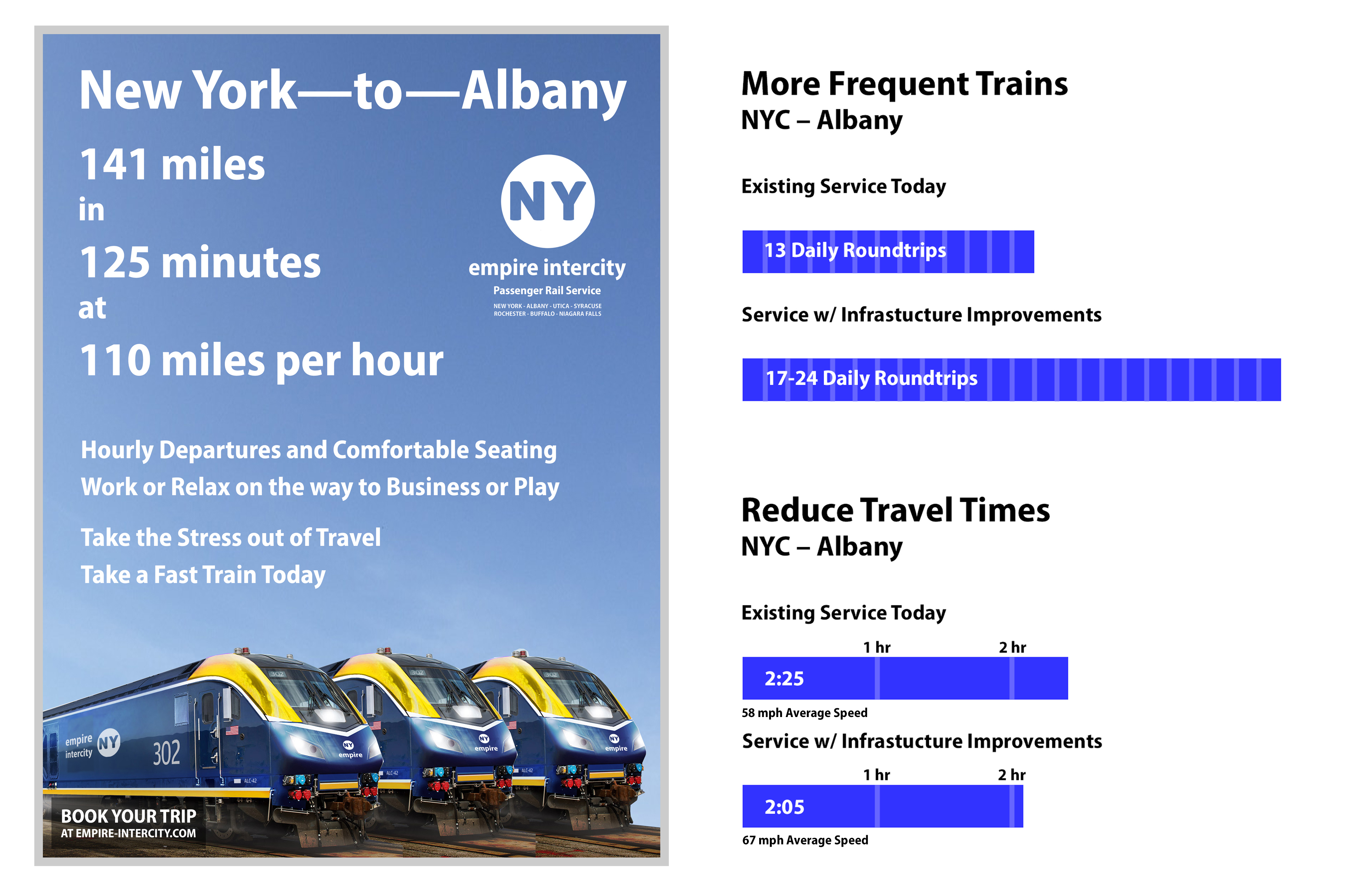 The New York State Department of Transportation (NYSDOT) and the Federal Railroad Administration released in Spring 2014 the High Speed Rail Empire Corridor Tier 1 Draft Environmental Impact Statement (DEIS), a detailed environmental analysis of improvements to passeneger rail service along the Empire Corridor to make connections between cities faster, more frequent, and more reliable. The 463-mile Empire Corridor runs north and south between Albany and New York City, and east and west between Albany and Niagara Falls. As of Summer 2021 release of the final EIS has been delayed to 2022.