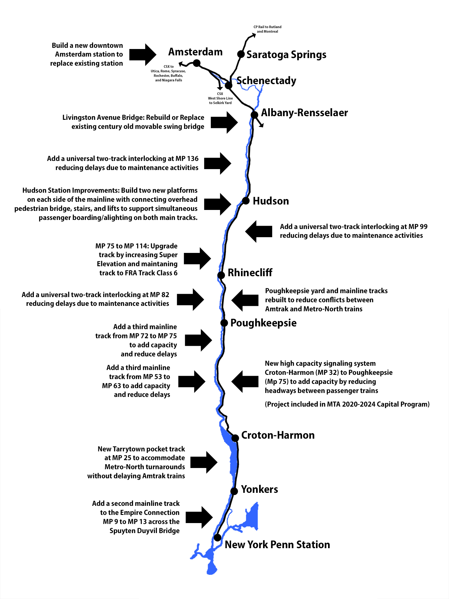 The first group of projects are all in the Hudson Valley and where first compiled in the Hudson Line Railroad Corridor Plan that was released in 2005, and then subsequently included in the 2009 State Rail Plan, all the “build” alternatives (ALTs 90A, 90B, 110, and 125) of the 2014 Empire Corridor DEIS, and Amtrak infrastructure plans for the Northeast Corridor. According to the Empire Corridor EIS completing these projects would allow travel times NYC-Albany to be reduced to 2:05 from the current 2:25, with daily round-trip train frequency increased to 16-to-24 from the current 13 daily round trips. These projects would open longer segments of track for 110-mph running, reduce trip times and delays by adding new segments of third track to allow fast Amtrak trains to pass slower freight and commuter trains, and overall increase capacity to allow for an Amtrak to become hourly shuttle service between Manhattan and Rensselaer.